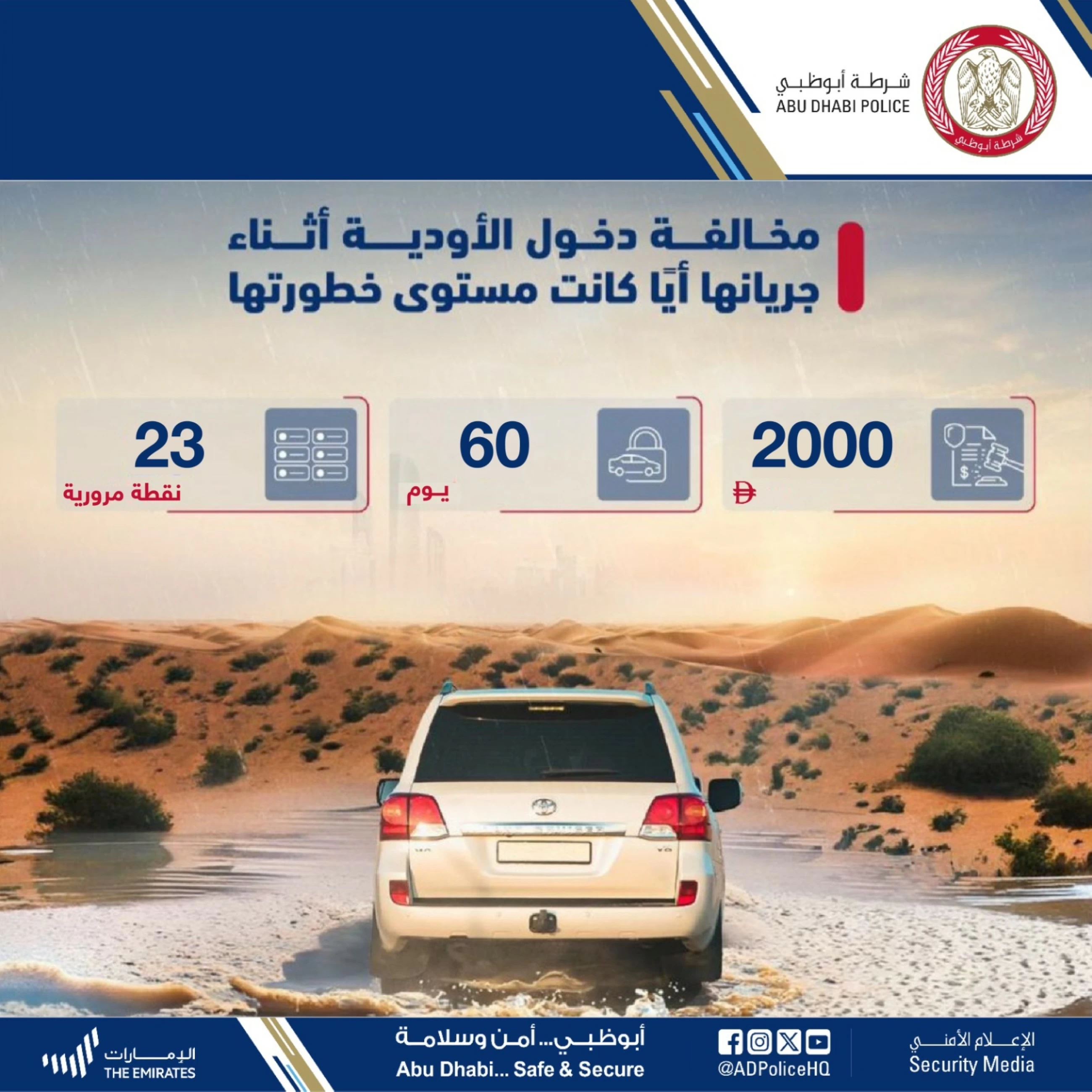 Violators face a fine of Dhs2,000, a 60-day impoundment of their vehicle, and 23 black points on their traffic code.