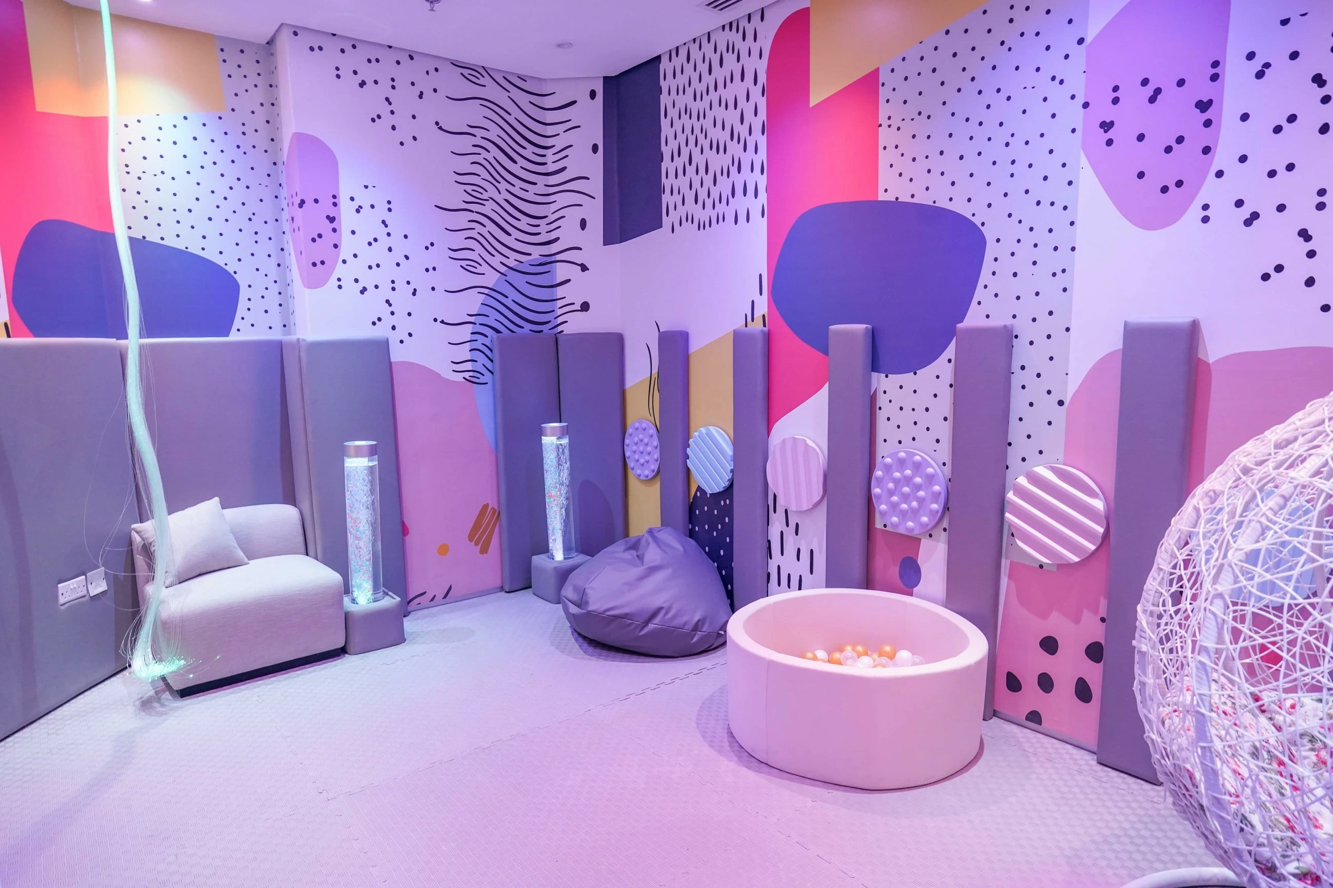 They feature a suite of specialised elements, including smart low-level lighting that creates a calming atmosphere, alongside interactive elements such as swings that support physical comfort. The rooms also incorporate audio-visual effects, including soothing music, natural scenes, and colourful visuals, helping to reduce sensory stress.
